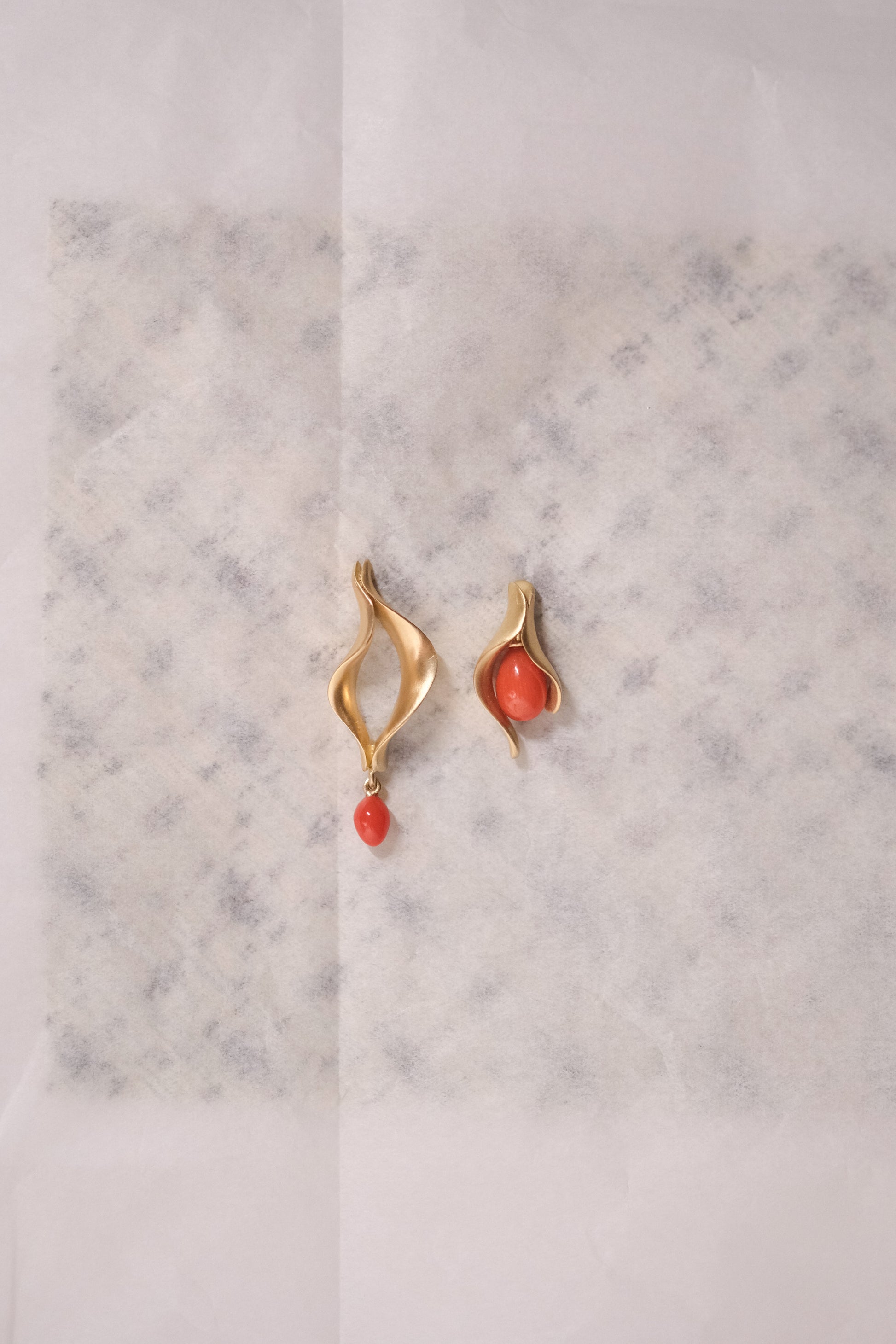 Metal: recycled 18k yellow gold. Red/orange coral